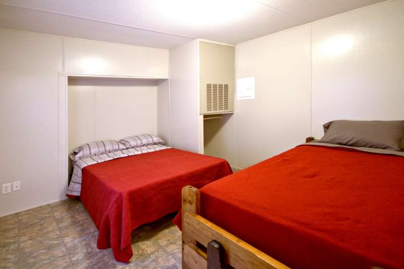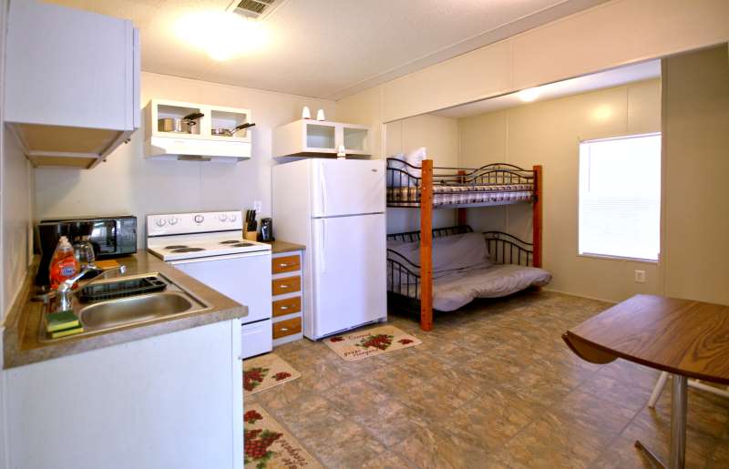 Cabin "Bee"This little cabin will comfortably sleep 6! The bedroom has a full and a twin bed while an area adjacent to the living room / kitchen has a full lower futon with a single upper bunk. |