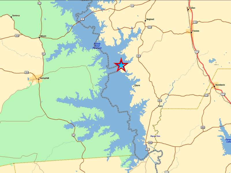 - Go to the Toledo Bend Dam. As you approach you will be on either US 96 or Texas 87. Watch for Highway 255 which goes to Toledo Bend Dam.