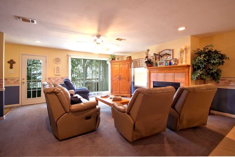 | The spacious upper living area opens onto the Upper Deck and has a wood burning fireplace | |||||||