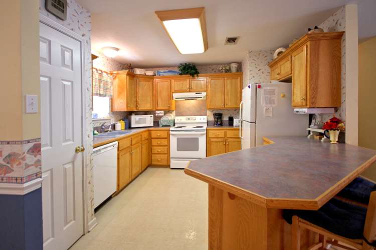 The spacious, fully equipped kitchen has a breakfast bar at one end and opens to the adjoining dining area. The kitchen and dining area look into the Upper Living Area |